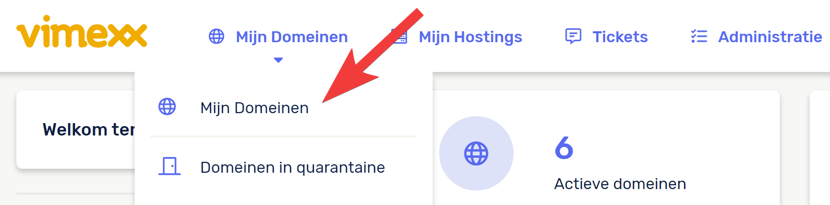 Wanneer je ingelogd bent in het Vimexx dashboard, zie je in het menu bovenaan Mijn Domeinen staan. Zodra je hier op klikt kom je op de overzichtspagina met al jouw domeinen terecht.