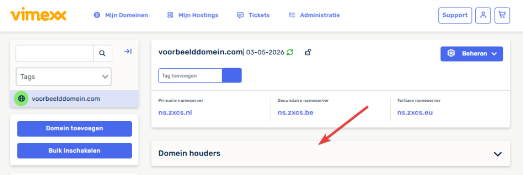 Vervolgens klik je op: Domein houders.